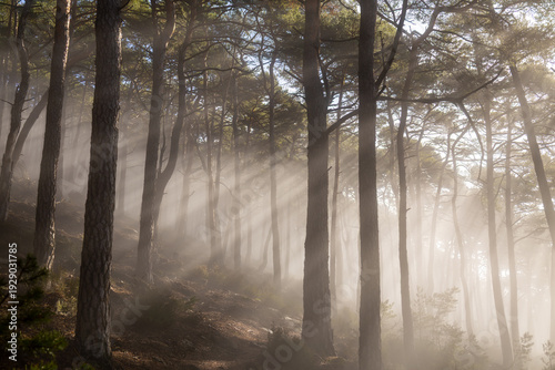 Sanfte Sonnenstrahlen durchbrechen im Pfälzerwald den morgendlichen Nebel und tauchen den stillen Wald in eine fast märchenhafte, ruhige Atmosphäre