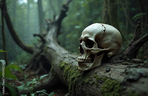 Human skull sits on moss covered fallen tree trunk in a dark eerie forest. Overgrown green foliage and decaying wood surrounds the skeletal remains. Mystery and death themes.