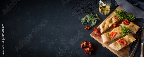Freshly baked Italian focaccia bread pieces with tomatoes and fresh herbs on black countertop. Typical of mediterranean cuisine. Horizontal close-up from above with space for text.