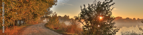 Early foggy morning, sunrise over the lake. Rural landscape. Dirt road along the lake. HDR