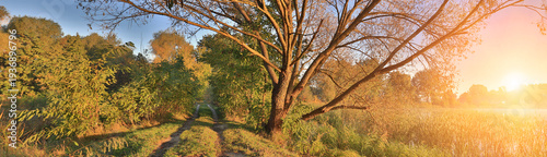 Early morning, sunrise over the lake. Rural landscape. Tree on the lakeshore. Dirt road along the lake. HDR