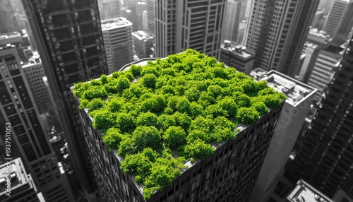 Urban skyscraper contrasts with bright green rooftop garden. This scene blends city architecture with nature. Green space offers urban renewal and eco-friendly design. Sustainable city living concept.