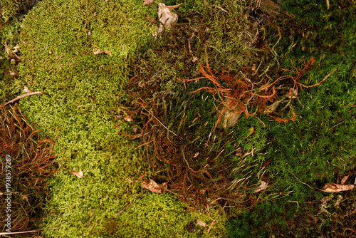 Close-up of a diverse forest floor showing various green and brown moss textures and details. Ideal for nature, texture,