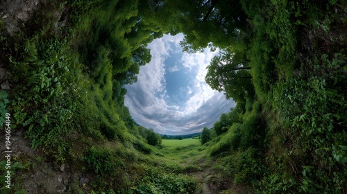 A surreal wide angle view looking up from a forest floor towards a bright sky and distant fields