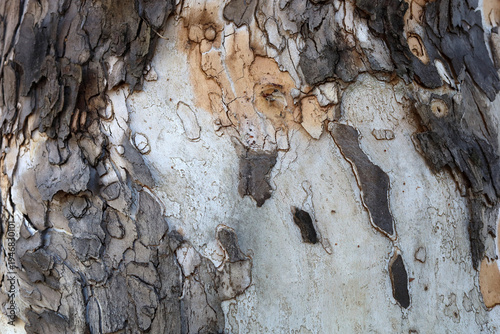 Peeling bark pattern on plane tree trunk