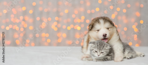 Alaskan malamute puppy hugs kitten on festive background. Empty space for text