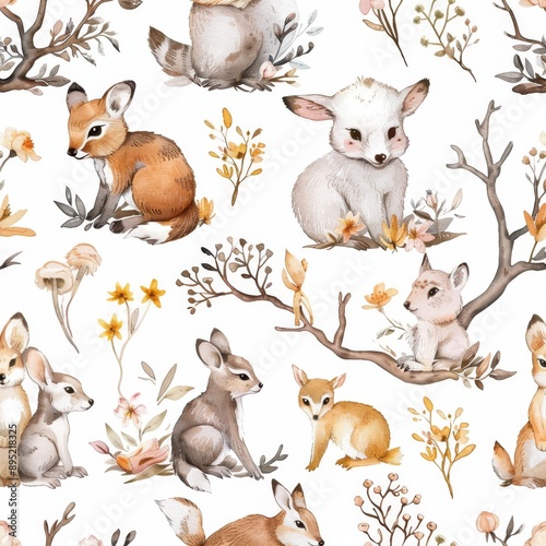 The watercolor nursery seamless pattern features hand-painted woodland animals, bunnies, rabbits, mice, in a forest summer landscape. Illustration for baby wallpaper, textiles, wall decor.