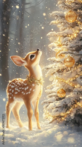 Deer Admiring a Golden Christmas Tree in a Snowy Winter Forest