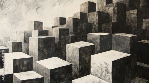 Oil painting showcasing a background composed of wooden cubes in a black and white palette