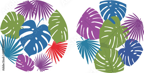 Colorful tropical leaves compositions with monstera and palm foliage in flat vector style isolated on white background