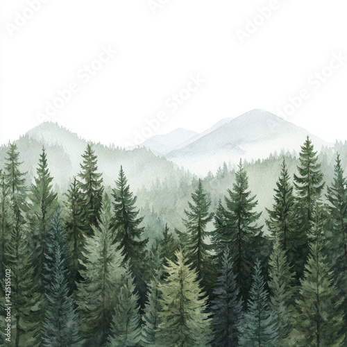 Lush green forest landscape with misty mountains background, evoking tranquility and nature