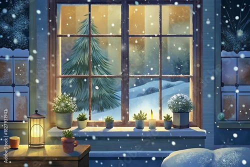 Cozy winter window scene with snow falling and warm lights