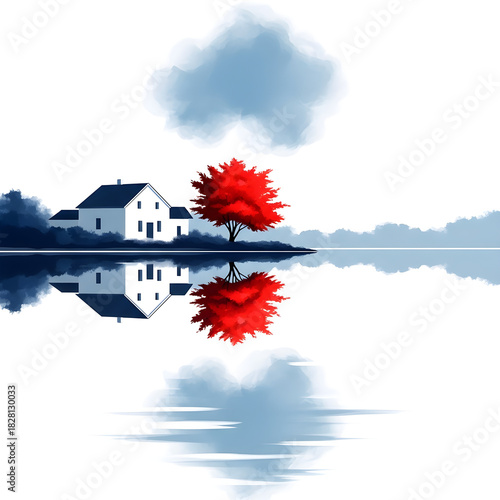 A serene landscape featuring a house, red tree, and its reflection on water
