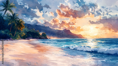 Scenic Watercolor Painting of a Tropical Beach at Sunset, with Palm Trees, Ocean Waves, and a Dramatic Sky