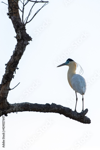Ein freigestellter Kappenreiher steht auf einem Ast in der Seitenansicht