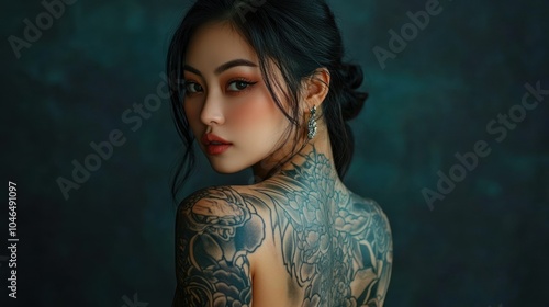 Asian beautiful model young woman tattoos art on her back background wallpaper AI generated image