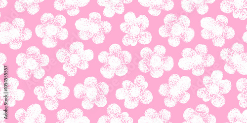 Flower pattern. Floral seamless pink vector background. Crayon spring simple print pattern. Chalk flower, abstract cute pastel summer design. Wax pencil modern child background. Floral pink crayon bg