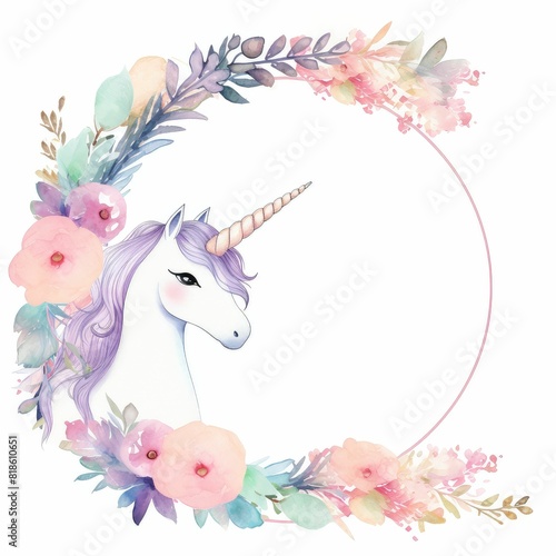 cute pastel unicorn themed frame or border for photos and text, watercolor illustration, Perfect for nursery art, simple clipart, single object, white color background.