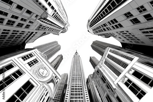 Minimalist line art of a city skyline with skyscrapers, clean lines representing the towering buildings, and a soft gradient sky in the background, capturing the elegance and simplicity of urban