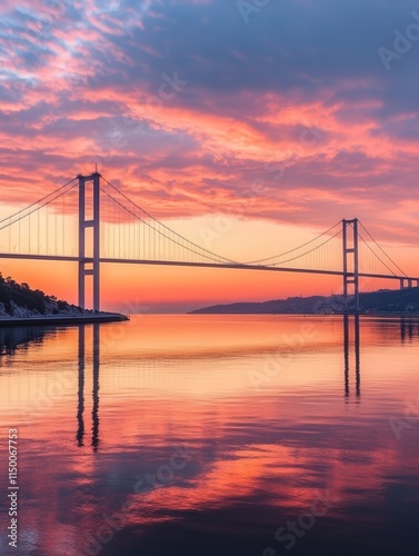 Bosphorus Strait at sunset, with the Istanbul Bridge elegantly crossing the water.
