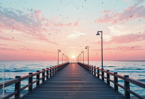 Vibrant Sunset Wooden Pier Street Lamps Birds Colorful Sky - Serene Coastal Landscape Travel Tourism Marketing, Evoking Tranquility Summer Vibes