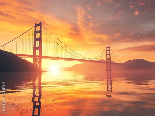 Golden Gate Bridge at Sunset Reflecting on Calm Water Surface
