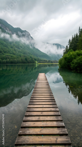Serene Still Lake with Wooden Steps and Misty Mountains