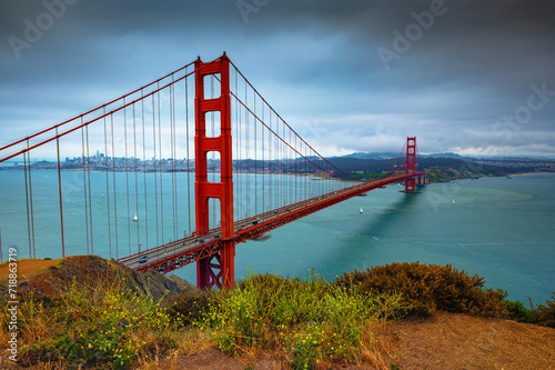 Golden Gate Bridge on a cloudy day with San Francisco city skyline in the background and flowers in the foreground.