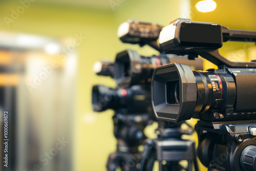 Digital movie cameras or video camera for journalist interview broadcasting reporter news or press conference speaker or public speaking or report record and content creator live media.
