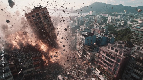 Catastrophic Earthquake Devastating Coastal City with Swaying Buildings and Falling Debris in Ultra-Realistic Footage