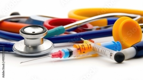 Assorted medical items: stethoscope, syringe, and thermometer isolated on a white background with generous copy space. No people, no logo.