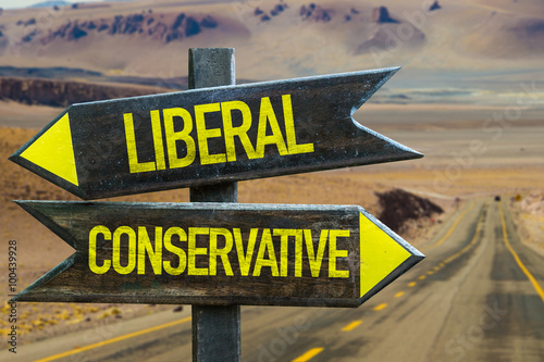 Liberal - Conservative signpost in a desert road on background