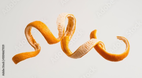 A single orange peel suspended in mid-air, creating a spiral shape against a plain white background.