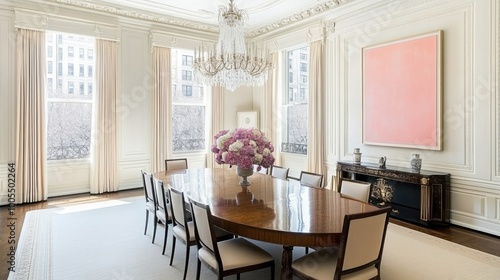 Elegant dining room with a large wooden table, chandelier, and artwork on the walls for a sophisticated ambiance