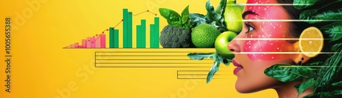 Harmony of Business and Vegan Lifestyle - Abstract Illustration with Plant-Based Foods and Wellness Themes on Financial Charts, Copy Space for Text