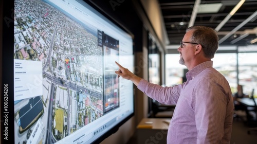 A business professional is actively pointing at a 3D model of a city displayed on a large touchscreen in a sleek conference room, focusing on infrastructure elements and planning zones
