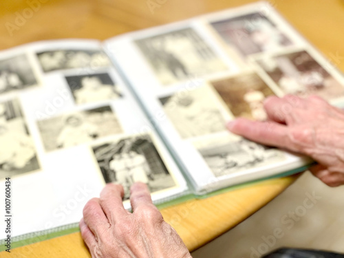 写真アルバムを指差して見る高齢女性の手元
