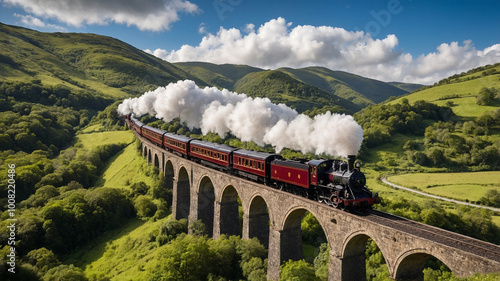 Steam train crossing a stone viaduct in a scenic green valley, framed by rolling hills and blue skies.
