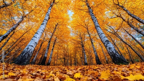 A photostock image of a vibrant autumn forest with trees displaying brilliant orange and yellow leaves