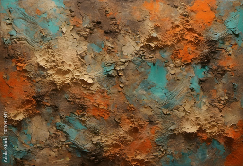 An abstract textured artwork featuring swirling patterns in turquoise, orange tones. The surface appears layered and three-dimensional, resembling natural elements like rocks or coral formations.