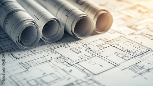 Na stole widzimy rozwinięte rolki architektoniczne z precyzyjnie narysowanymi planami budynków.