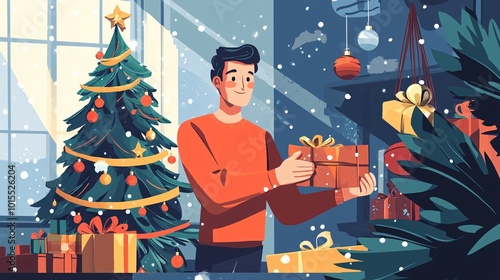 Cheerful Man with Christmas Gifts and Tree in Cartoon Style