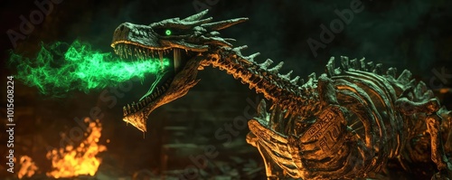 A fierce skeleton dragon emitting vibrant green flames, set against a dark, mystical background, perfect for fantasy-themed projects.