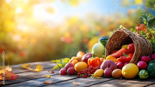 An autumn harvest cornucopia displays vibrant fruits and vegetables on a rustic wooden table under golden sunlight, celebrating seasonal bounty and farm-fresh ingredients.