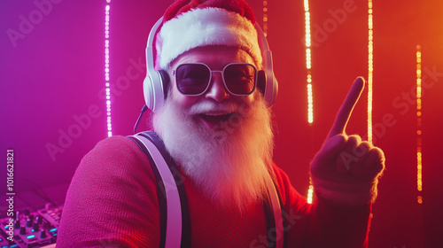 Święty Mikołaj w białych słuchawkach i z uśmiechem na twarzy gra najlepsze hity w klubie nocnym.