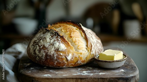 chleb na zakwasie, pieczywo, domowe, kuchnia, chleb, rustykalny, wypiek, złocista skórka, świeże pieczywo, jedzenie, kuchnia domowa, fotografia kulinarna, ciepło, przytulność, masło, drewniana deska,
