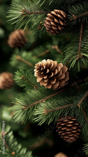 Image of pine cones nestled among lush evergreen branches, evoking a natural winter feel, embodying tranquility and rustic beauty.
