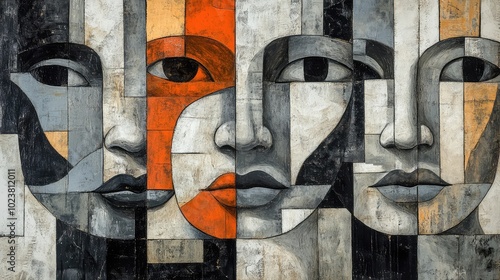 abstract cubist collage of fragmented faces with interlocking shapes in gray, black, white, and orange on an aged paper background