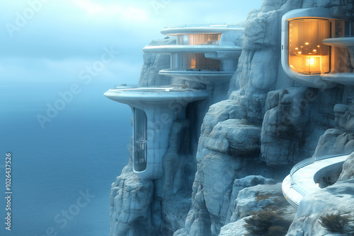 Nowoczesne, futurystyczne budynki o zaokrąglonych kształtach, osadzone na skalnym klifie. Ich wnętrza rozświetla ciepłe, pomarańczowe światło.