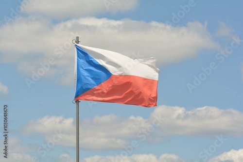The national flag of the Czech Republic (Czechia) flies up a flagpole on a beautiful summer day with a background of blue sky and white clouds.
